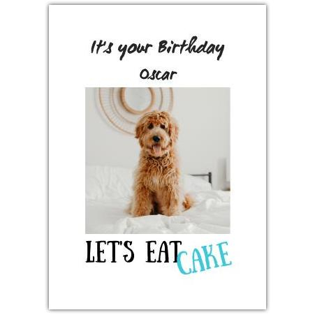 This charming birthday card features an adorable photo of a playful, fluffy dog sitting comfortably, sure to bring a smile to any pet lover’s face. The warm, friendly design is personalised with the recipient's name, making it a truly unique and heartwarming way to say, "It's your Birthday, let's eat cake!"