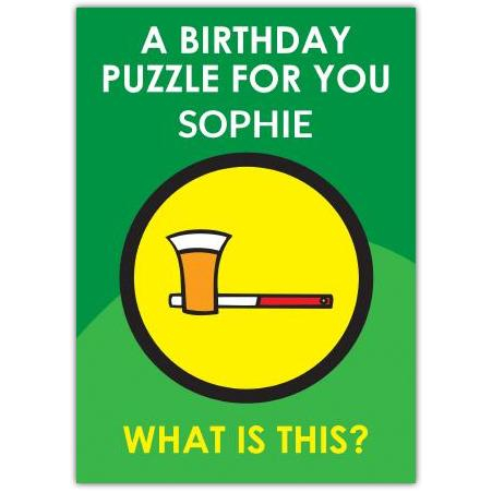 This bright green card features a clever visual pun, inviting the recipient to solve the fun puzzle: a glass of lager cleverly combined with a matchstick, prompting the question, "What is this?" It’s a perfect choice for anyone who enjoys a bit of humour and a good puzzle on their special day.