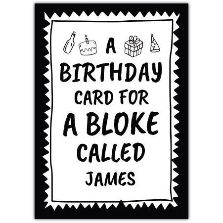 Celebrate his special day with this stylish and personalised birthday card, perfect for any bloke named James or the name of your choice. The bold black and white design gives it a modern and striking look, while the playful icons of a bottle, cake, gift, and party hat add a fun festive touch.