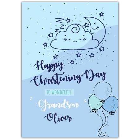 Celebrate a special boy’s Christening with this charming Blue Balloon Cloud Greeting Card. Featuring a serene design of a sleepy cloud nestled among stars and a crescent moon, alongside cheerful blue balloons, this card captures the peaceful and joyful spirit of the day. The soft blue tones make it perfect for welcoming a baby boy into the faith and family.