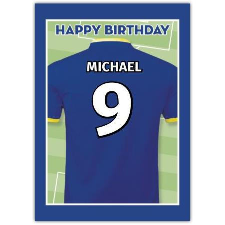 Featuring a bold blue football jersey set against a green pitch background, this card is perfect for anyone who loves the beautiful game. The design includes a prominent number on the back of the shirt – which you can personalise with a name and favourite number – making it a thoughtful, unique way to say happy birthday.
