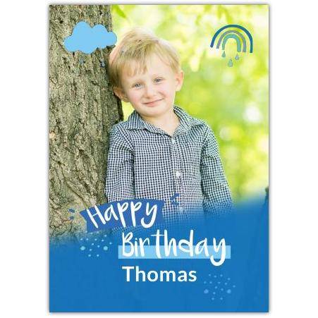 This charming card features a large photo area framed in a soft, blurry blue overlay, perfectly highlighting your chosen image. Accented with playful blue clouds and a colourful rainbow, it brings a cheerful and bright touch to every birthday greeting.