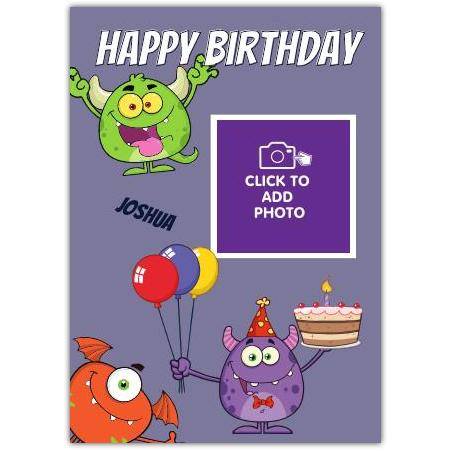 Bring a smile to any birthday boy’s face with this playful and colourful monster-themed birthday card. Set against a vibrant purple background, this cheerful design features three adorable and friendly monsters celebrating with balloons and a delicious birthday cake — the perfect way to add a fun and lively touch to your birthday wishes.