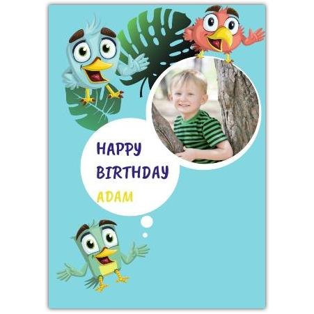 This charming Birds One Photo Birthday Greeting Card is a delightful way to send birthday wishes that truly stand out. Featuring three cheerful, colourful cartoon birds set against a vibrant blue background with tropical leaves, this card brings a fun and playful vibe to any birthday celebration.
