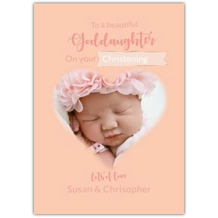 This beautiful card is perfectly crafted to honour the special occasion of a goddaughter’s christening. Featuring a gentle pastel orange background that radiates warmth and joy, the design centres on a heart-shaped photo frame showcasing a serene image of a sleeping baby adorned with a delicate flower headband — a touching tribute to this cherished milestone.