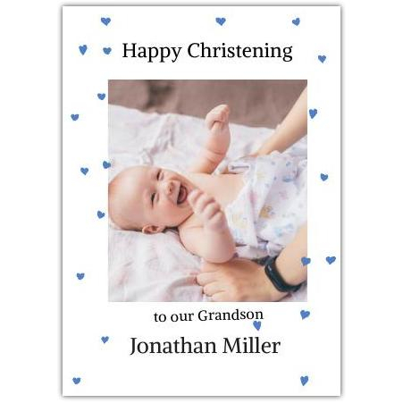 Personalised Christening Card for Grandson with Blue Hearts and Photo Upload
