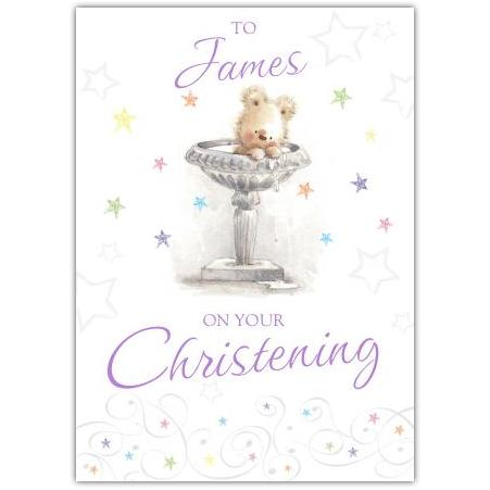 Personalised Christening Card with Teddy Bear in Birdbath Design for Baby or Child