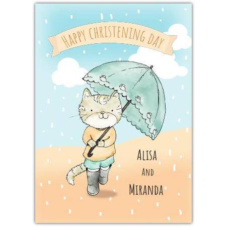 This delightful Christening Day Kitty Cat Greeting Card combines sweet watercolor artistry with a heartwarming message, perfect for marking this precious occasion. Featuring an adorable brown kitten holding a lovely blue-green umbrella beneath gentle raindrops and soft clouds, this design captures innocence and joy in the most charming way.
