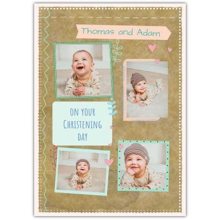 Personalised Christening Day Scrapbook Photo Greeting Card with Hearts and Leaf Design