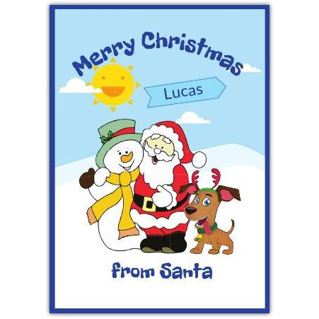 Brighten up the festive season with this cheerful Christmas Sunny Snowdog Greeting Card. Featuring a joyful scene with Santa, a smiling snowman, and a playful reindeer-dog against a sunny winter sky, this card perfectly blends warmth and whimsy for a delightful Christmas message.