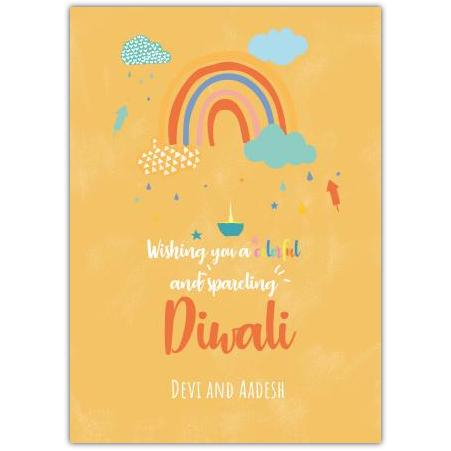 Celebrate the joyous festival of Diwali with this vibrant and heartwarming greeting card. Featuring a bright yellow background adorned with a colourful rainbow, charming clouds, and sparkling lights, this card radiates positivity and festive cheer.