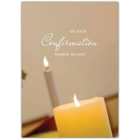 This elegant confirmation card features a serene image of gently glowing candles, symbolising light, faith, and new beginnings. The soft, warm hues create a peaceful and reflective mood, perfect for honouring such a meaningful occasion.