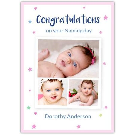 This charming Congratulations Baby Girl Pink Stars Card is the perfect way to mark the joyous occasion of a naming day. Featuring a delicate border of soft pink stars against a clean white background, this personalised card allows you to add precious photos of the new arrival—creating a truly unique keepsake for family and friends.