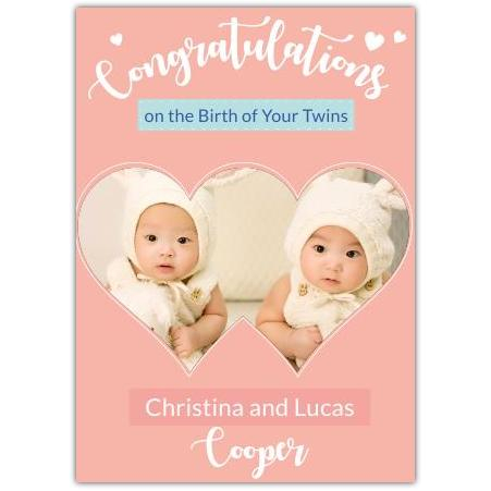 Celebrate the joyous arrival of twins with this charming Congratulations on the Birth of Your Twins Double Heart Photo Card. Featuring a soft pink background and two heart-shaped photo frames, this card allows you to personalise the front with adorable pictures of the newborns, making it a truly unique keepsake.
