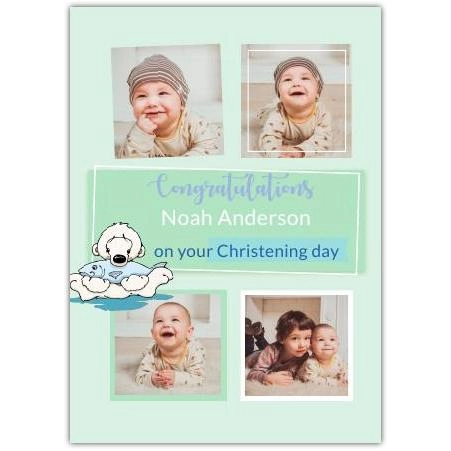 This charming card features an adorable polar bear illustration holding a fish on a soft green background, perfectly complementing the joy and innocence of this sacred occasion. With space for up to four photos, you can create a thoughtful keepsake by adding your own treasured images of the little one, making it truly unique and heartfelt.