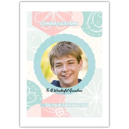 This beautifully designed card features soft pastel colours with delicate floral patterns, making it a charming keepsake for such an important occasion. The personalised photo on the front adds a warm, personal touch that your grandson will treasure.