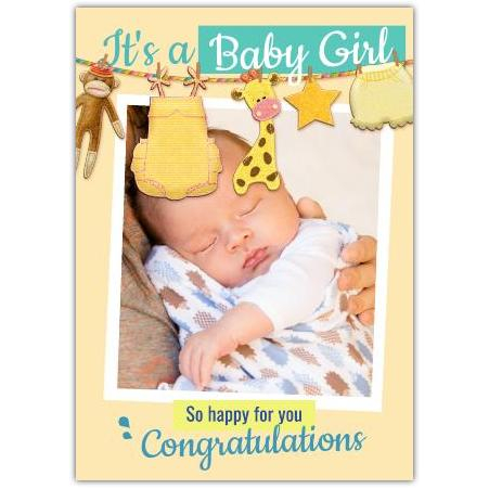 The card’s heartwarming message, "It's a Baby Girl – So Happy For You. Congratulations.", makes it an ideal way to share your best wishes with new parents. Plus, you can upload a cherished photo on the front to create a truly unique keepsake that will be treasured for years to come.