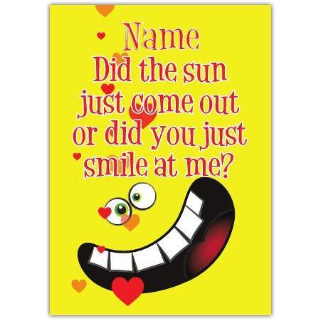 Did You Just Smile At Me? Brighten someone's day with this cheerful and playful greeting card. Featuring a bold yellow background, a big smiling mouth, and lovable hearts, it's the perfect way to say, "Did the sun just come out or did you just smile at me?" This card can be personalised with a name on the cover, adding a special touch that will make your recipient feel truly unique and appreciated.