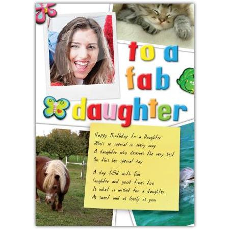 Celebrate your amazing daughter’s special day with this delightful "Fab Daughter Photo Birthday Card". Featuring colourful, playful text and charming images — including a space for your own photo on the cover — this card is bursting with warmth and personality.