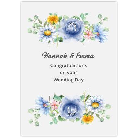 This beautifully designed card features delicate watercolor flowers in soft blues, yellows, and whites, arranged gracefully at the top and bottom. The personalised names make it the perfect keepsake for the happy couple. The simple yet heartfelt message, “Congratulations on your Wedding Day,” adds a warm and sincere touch.