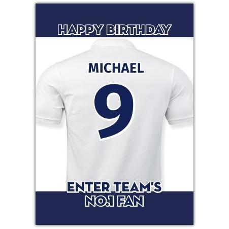 This striking card features a classic white football jersey with bold blue lettering and a large number on the back, making it the perfect way to acknowledge the No. 1 fan in your life. You can personalise the shirt with the recipient’s name and their favourite team number, creating a unique and memorable birthday greeting.