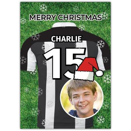 Score a perfect festive greeting with this unique Personalised Football Christmas Card, designed especially for football lovers. Featuring a striking football kit on a lush green pitch background, this card brings the spirit of the game right into your Christmas wishes.