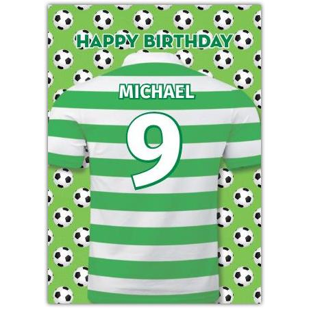 Kick off a special birthday celebration with this personalised greeting card, perfect for football fans of all ages! Featuring a vibrant green and white football jersey design against a playful football-patterned background, this card is sure to score big with the recipient.