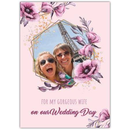 Celebrate the magic of your wedding day with this stunning For My Gorgeous Wife card, designed to make your special someone feel truly cherished. Featuring delicate pink floral artwork and an elegant gold geometric frame, this card perfectly blends romance and beauty. What makes it even more memorable? You can upload your own photo on the cover, capturing a cherished moment together to personalise this card just for her.