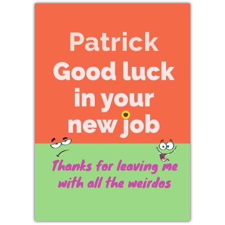 This lively card features a bold orange and green design topped with a playful message: "Good luck in your new job," followed by the humorous line, "Thanks for leaving me with all the weirdos." It's a perfect way to send warm wishes mixed with a little laughter for that colleague, friend or family member embarking on a fresh career adventure.