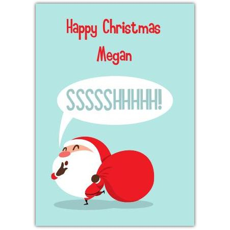 This delightful card features a playful Santa tiptoeing with a large red sack, softly whispering "SSSSHhhhhhh!"—perfect for sharing a touch of Christmas magic and fun. The cheerful design and personalised greeting make it an ideal choice for sending warm holiday wishes to friends, family, or loved ones.