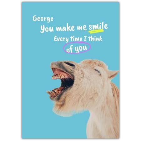 This cheerful card features an animated, smiling donkey against a vibrant turquoise background paired with the heartfelt message, "You make me smile every time I think of you." It's the perfect way to let someone special know they’re on your mind and bring a smile to their face.