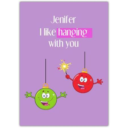 Personalised Funny Valentine Card I Like Hanging With You Purple Baubles Design