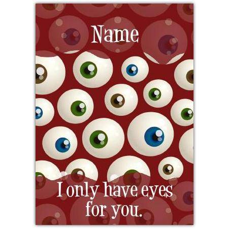 Express your love with a quirky twist using this fun and humorous Valentine’s Day card. Featuring a bold, red background scattered with colourful, cartoon-style eyeballs, this unique design is sure to catch the eye and bring a smile to your special someone's face. The playful message, "I only have eyes for you," adds a romantic and lighthearted touch that makes it perfect for celebrating your affection in a memorable way.