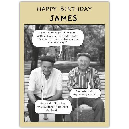This charming personalised birthday card is perfect for anyone with a great sense of fun, especially those who appreciate a cheeky joke and a bit of banter. Featuring a vintage-style black and white photo of two older gentlemen sharing a laugh, the card delivers a witty, humorous exchange that’s sure to bring a smile to the recipient’s face.