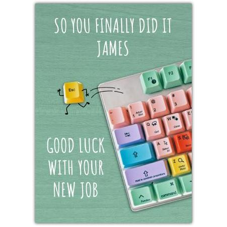 This colourful card is the perfect way to congratulate someone special on securing a new job. Featuring a playful keyboard design with a lively Escape key making a cheerful exit, it captures the excitement and fresh start that comes with new career opportunities.