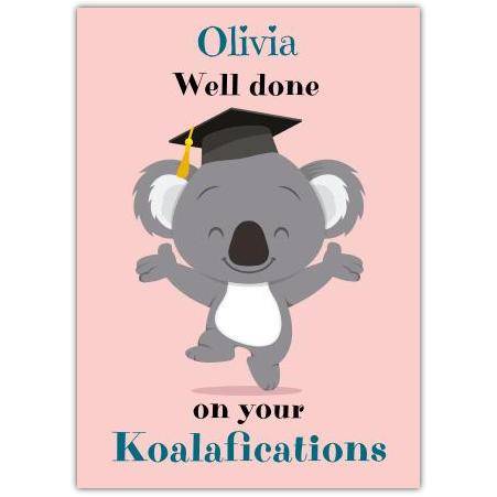 This charming personalised graduation card is the perfect way to say "Well done" to someone special. Featuring an adorable cartoon koala wearing a graduation cap, this card cleverly plays on words with "Koalafications," adding a delightful sense of humour and warmth to your congratulatory message.