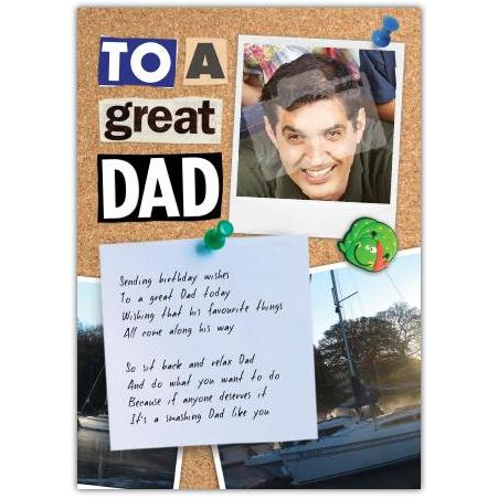 Celebrate your amazing Dad’s birthday with this heartfelt and personalised photo birthday card. Featuring a charming corkboard design complete with a space for a favourite photo, this card is a touching tribute to the special man in your life.