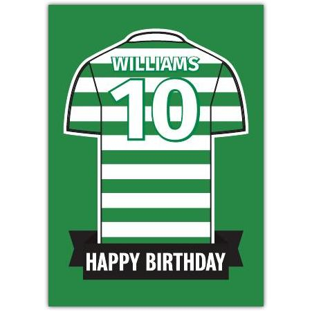 This vibrant card features a classic football jersey design in bold green and white stripes, complete with a personalised name and number on the back, making it perfect for any football enthusiast. The striking “Happy Birthday” banner adds a cheerful touch that will score points with your recipient.
