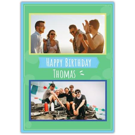 Celebrate a special birthday with this personalised greeting card that features a vibrant green background and spaces for two cherished photos. This card is perfect for adding your own memorable snapshots, making it a truly unique keepsake that the recipient will treasure.
