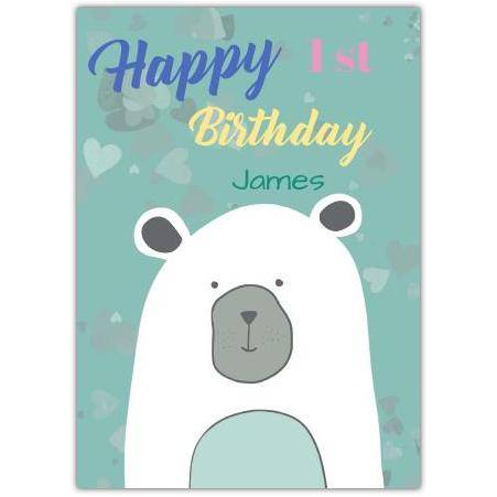 Brighten up the 1st birthday celebration of a baby boy with this charming and playful card featuring a cute polar bear against a soft green background. The sweet design is perfect for marking this important milestone with warmth and joy.