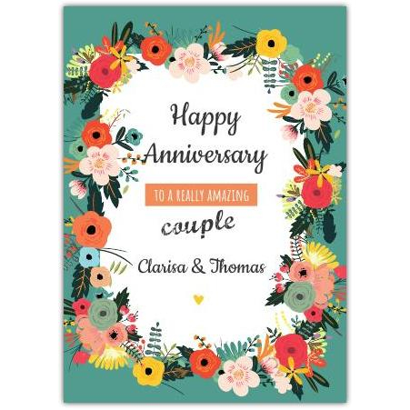 Celebrate love with this charming Anniversary Flower Border Greeting Card. Featuring a vibrant floral frame in a soothing green backdrop, this card beautifully combines elegance and cheerfulness. The delightful flower border surrounds a heartfelt message that can be personalised with the names of your special couple, making it truly unique and memorable.
