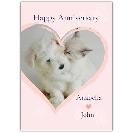 Celebrate love and companionship with this Anniversary Kitten Puppy Heart Greeting Card, featuring an adorable image of a fluffy puppy and a gentle kitten sharing a tender moment. Set against a soft pink background with delicate heart details, this charming card perfectly captures the warmth and affection of an anniversary celebration.