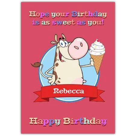 This delightful Birthday "As Sweet As You" card features a charming cartoon cow holding a creamy ice cream cone against a cheerful pink backdrop. With bright, colourful lettering that reads, "Hope your Birthday is as sweet as you!", this card perfectly captures the joy and warmth of any birthday celebration.