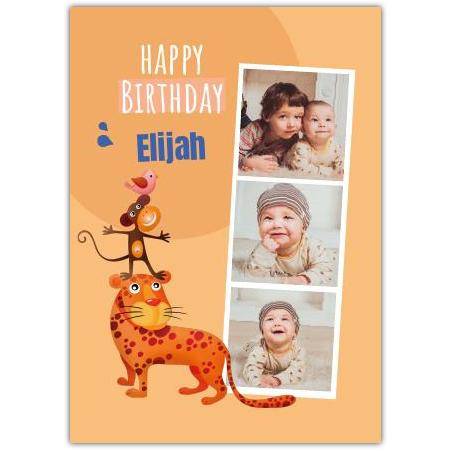 Celebrate a special birthday with this delightful personalised photo card, featuring a charming trio of animal friends: a playful tiger, cheeky monkey, and a sweet little bird.