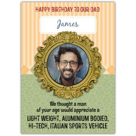 This charming birthday card is perfect for showing your dad some love and laughter on his special day. Featuring a stylish, vintage-inspired design with a gold ornate frame, this card allows you to add a personalised photo and name, making it a truly unique keepsake.