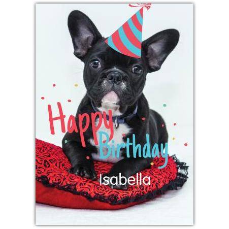 Featuring a charming French Bulldog wearing a colourful party hat, this card is perfect for dog lovers and anyone who appreciates a fun, lighthearted birthday greeting. The lively design is brightened with cheerful confetti and the bold "Happy Birthday" message, making it an ideal way to send warm wishes.
