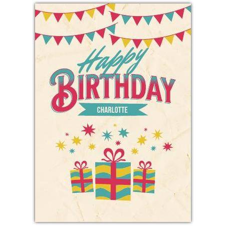 This cheerful card features colourful bunting, festive stars, and three beautifully wrapped presents, perfectly capturing the joy of a birthday celebration. The bold, retro-style lettering of "Happy Birthday" is complemented by the option to personalise the card with the recipient’s name on the cover, making your greeting truly unique and memorable.
