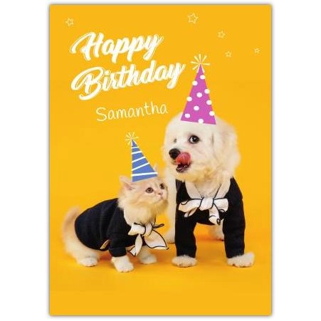 Celebrate with a smile! This charming Happy Birthday Any Name Funny Dogs Card is perfect for adding a touch of humour and cuteness to any birthday celebration. Featuring an adorable white dog and fluffy cat both dressed in smart outfits and festive party hats, this card is sure to bring joy and laughter to the birthday recipient.