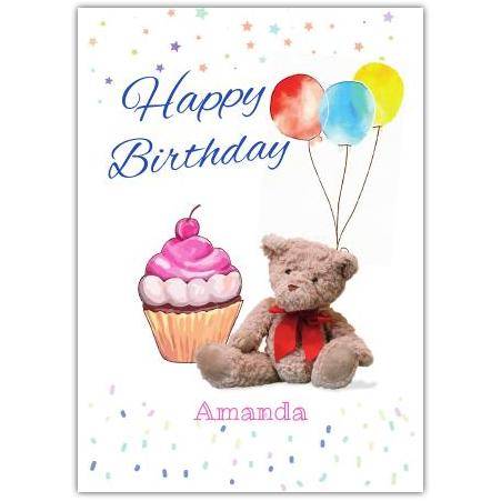 - Adorable Design: Featuring a sweet pink-frosted cupcake, a cuddly teddy bear holding colourful balloons, and a sprinkle of festive stars and confetti, this card exudes warmth and joy.