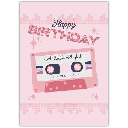 This charming birthday card features a retro cassette tape design with the words "Michelle's Playlist" and "The Best Hits," set against a soft pink background with sparkly accents. Perfect for a music lover, this card brings a nostalgic vibe while sending warm birthday wishes.